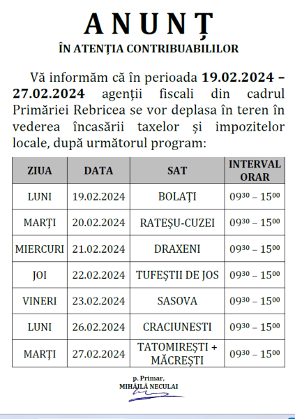 Anunț privind încasarea taxelor și impozitelor locale în perioada 19.02.2025 - 27.02.2025